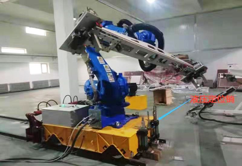 軌道小車作為搭載平臺(tái),臺(tái)車采用軌道硬導(dǎo)向,采用系統(tǒng)控制和其他設(shè)備聯(lián)動(dòng),采用伺服電機(jī)和編碼器給車輛采用精確定位,誤差精度±2mm。同時(shí)因?yàn)樽トC(jī)械臂的重心高,采用液壓夾軌器把臺(tái)車和軌道連接在一起,防止車輛的側(cè)翻。